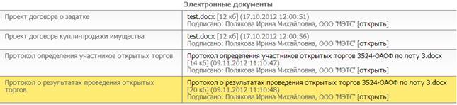 После подписания электронной цифровой подписью сформированных протоколов, они размещаются на информационной карте торгов, в разделе «Электронные документы»