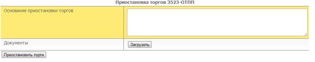 Чтобы приостановить торги необходимо указать основание для приостановки торгов и приложить вложения. После чего необходимо нажать кнопку «Приостановить торги» (рис. 5.13). Организатор торгов может приостановить торги только по всем лотам сразу.