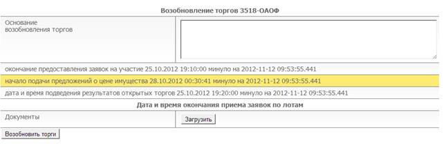 Чтобы возобновить торги, необходимо перейти по ссылке «Возобновить торги», далее откроется новая страница, на которой организатор торгов должен прописать основание для возобновления торгов и указать дату и время окончания предоставления заявок на участие в торгах, дату и время начала подачи предложений о цене имущества, и дату и время подведения результатов открытых торгов (рис. 5.16).