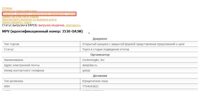 После окончания подачи предложений о цене имущества в списке операций появляется возможность автоматически сформировать протокол о результатах проведения открытых торгов (пункт меню «Получить протокол о результатах проведения открытых торгов»).