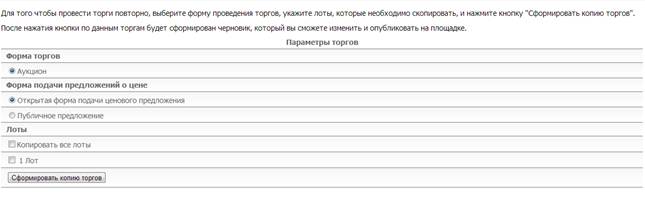 При нажатии на кнопку «Сформировать копию торгов» сформируется информационная карта новой торговой процедуры со статусом «В работе» (текущая запись не меняется). Ее можно будет редактировать, нажав на ссылку «Редактировать торги» в верхнем меню информационной карты торгов.