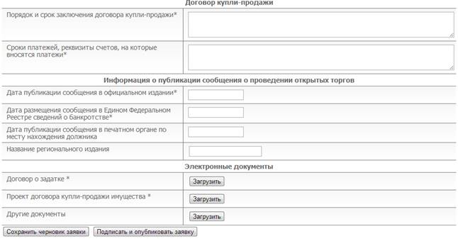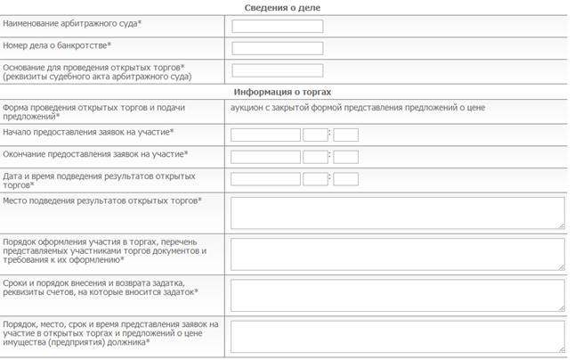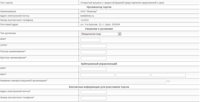 Для регистрации процедуры открытых торгов с закрытой формой подачи предложений о цене имущества (предприятия) должника необходимо перейти по ссылке «Подача заявки на проведение торгов». Откроется страница для выбора формы торгов и формы подачи предложений о цене. В разделе «Форма торгов» необходимо выбрать, требуется ли провести аукцион или конкурс, а в разделе «Форма подачи предложений о цене» - «Закрытая форма подачи ценового предложения». Форма для представления заявки на проведение открытых торгов для организатора торгов представлена на рис. 6.1.