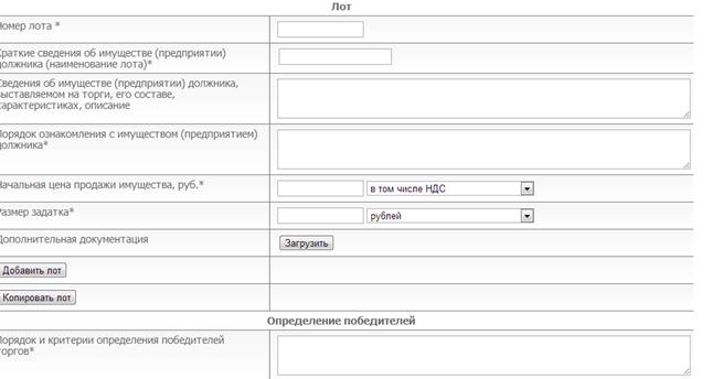 Регистрация, а также проведение открытого аукциона и открытого конкурса с закрытой формой подачи заявок полностью идентично, за исключением отсутствия для процедуры открытого аукциона поля «условия конкурса».