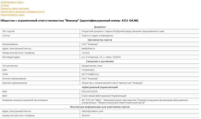 Вверху информационной карты находится меню доступных операций, которые изменяются в зависимости от стадии, в которой находится процедура открытых торгов.