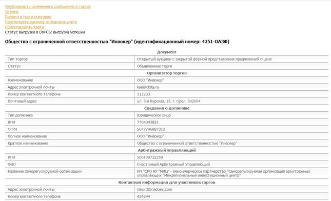 Основание для проведения открытых торгов* (реквизиты судебного акта арбитражного суда) | Указываются реквизиты судебного акта арбитражного суда. Например: Решение Арбитражного суда Орловской области по Делу № ___ от 01.01.2001 г. | |