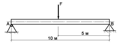 Брус постоянного сечения опирается на две опоры, одна из которых шарнирная, вторая – угловая (ребро). В середине бруса приложена поперечная изгибающая сила F = 200 Н.