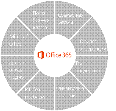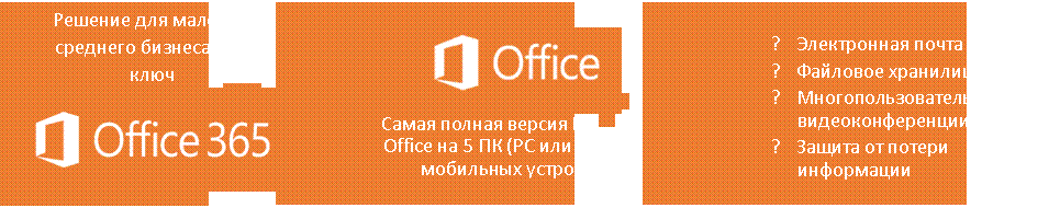· Решение под ключ по предсказуемой цене o Избавляет от необходимости в покупке и поддержания работоспособности серверов и ПО и связанных с ними расходов и рисков o Предсказуемая стоимость на лицензии и услуги ИТ · Максимальная защита от потери информации o Данные хранятся в защищенном хранилище с работоспособностью 99.9% и финансовой гарантией Microsoft o Автоматические резервное копирование и синхронизация – при утере данных или устройства, остается резервная копия в хранилище · Многоуровневый контроль над данными в организации o При уходе сотрудника его почтовая переписка и документы остаются в организации o Назначение и управление политиками доступа к почте с мобильных устройств o Защищенный доступ к документам с возможностью его индивидуальной настройки o Почта и документы защищены от вирусов, спама и несанкционированного доступа · Минимальная нагрузка на IT-персонал, так как все обслуживающие функции выполняет Microsoft o Удобный в использовании интерфейс панели администрирования для добавления и удаления пользователей, настройки почты и установки политик обмена файлами | · Удаленный доступ к почте и документам в любое время с различных устройств: PC, Windows Tablet, Mac, Windows Phone, iPhone или Android phone · Не требуется постоянный доступ к интернету – автоматическая синхронизация при наличии интернета · Персональный и общий календари, индикация присутствия сотрудников, общая адресная книга организации · Обмен сообщениями · Проведение видео/аудио совещаний с помощью многоточечных видеоконференций с высоким качеством изображения, записями заметок, общим экраном (shared desktop) и общим доступом к документам в режиме реального времени · Защищенный доступ к документам с возможностью индивидуальной настройки прав и совместная работа с документами, обмен документами с клиентами и партнерами · Возможность одновременного совместного редактирования документов · Office по запросу: возможность использования полнофункциональной виртуализированной копии Office без его установки на любом ПК под управлением Windows 7 или 8 | · Экономия на лицензировании: самая полная версия Microsoft Office на 5 ПК (PC или Mac) и 5 мобильных устройств (Windows Phone, iPhone, Android Phone) одного пользователя · Избавляет от необходимости покупки, поддержания и обновления собственных почтовых и файловых серверов · Минимальные первоначальные затраты · Гибкость при увеличении/уменьшении штата компании · Бесплатное обновление приложений до новых версий · |