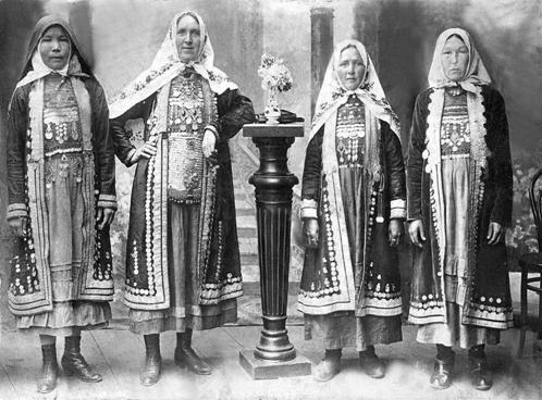 Елэн | Их шили не только темными (как на юго-востоке), но и цветными, предпочитая приталенный, расклешенный в полах крой (особенность юго-западного костюмного комплекса). Употребляли ткани зеленые, разных оттенков синие, вишневые. Согласно принятым в этих краях обычаям, монеты не помещали вразброс на полах одежды, не покрывали ими спинку на лопатках, как было принято в юго-западном комплексе, а располагали по контуру одежды вокруг позумента у полочек, на талии и горловине. Женские елэны могли иметь эполеты с позументной бахромой (особенность юго-восточного комплекса). У пояса скреплялись ажурной пряжкой застёжкой - каптырма( элемент юго-западного комплекса). |