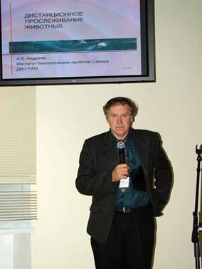 Затем с докладом-лекцией «Методы исследования морских птиц в открытых районах моря» выступил д. б.н. Юрий Владимирович Краснов (рис.3).