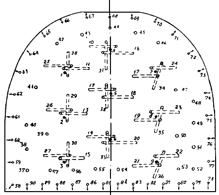 1…9 - запрессовочные шпуры (мгновенное взрывание); 10…27 - отбойные шпуры (1-я ступень замедления); 28…36 - отбойные шпуры (2-я ступень замедления); 38...51 - вспомогательные шпуры (3-я ступень замедления); 37; 52…57 - вспомогательные шпуры (4-я ступень замедления); 58...78 - контурные шпуры (5-я ступень замедления); 79...90 - подошвенные шпуры (6-я ступень замедления)