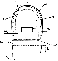 1 - контурные шпуры; 2 - площадь забоя, взрываемая контурными шпурами; 3 - контур обнажения, создаваемый взрывом зарядов вспомогательных отбойных шпуров; 4 - площадь забоя, взрываемая вспомогательными отбойными шпурами; 5 - площадь забоя, взрываемая врубовыми шпурами; 6 - подошвенные (почвенные) шпуры;