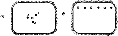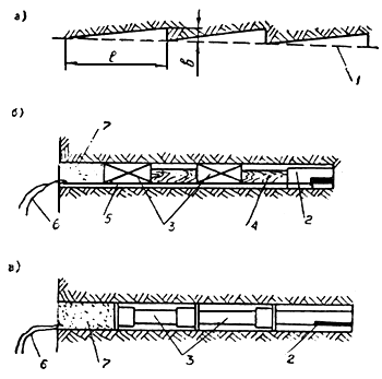 Рис.2.14. Расположение контурных шпуров и конструкция зарядов для контурных шпуров: