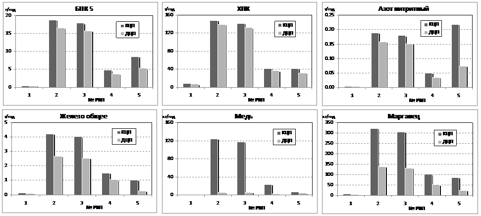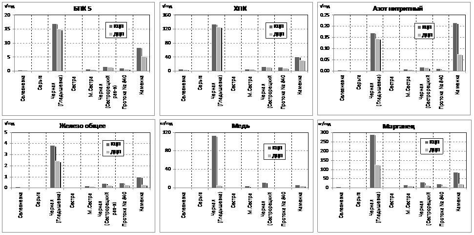 Рисунок 3.2 – Сравнительная диаграмма значений КЦП и ДЦП для индикаторных показателей по водным объектам бассейна