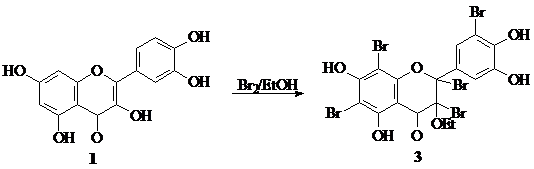 Нами изучена реакция кверцетина с бромом в этиловом спирте. Взаимодействием кверцетина 1 с тремя эквивалентами брома в абсолютном EtOH в присутствии молекулярных сит 4 À при 0-5 °С с последующим выдерживанием реакционной смеси при 20-22 °С в течение 22-24 ч получен 6,8,5'-трибромкверцетин 2, с пятью эквивалентами брома – 3-О-этиловый эфир 2,3,6,8,5’-пентабромдигидрокверцетин 3. Данное соединение получено нами впервые.