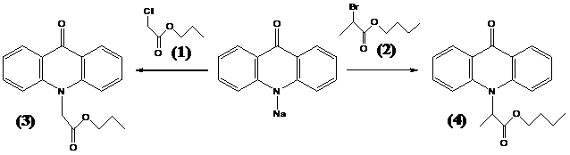 Установлено, что при взаимодействии пропилового эфира хлоруксусной (1) и бутилового эфира α-бромпропионовой (2) кислот с акридоном металлированным натрием при температуре 100 оС в ДМСО в течение 6 часов образуются соответствующие алкиловые эфиры акридонуксусной (3) и α-акридонпропионовой (4) кислот с выходами 90% и 93%, соответственно.