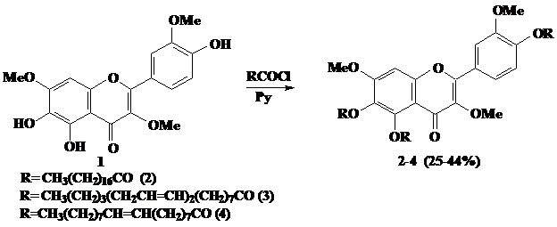 Было показано, что, попадая в организм человека, природные полифенолы претерпевают биодеградацию ферментами ЖКТ, превращаясь в метаболиты. Более того, содержание данных метаболитов в крови и лимфе очень мало. Однако имеются данные о превращении некоторых их ацилпроизводных после прохождения биологических барьеров в исходные флавоноиды [1-4]. Поэтому становится актуальным синтез прекурсоров природных полифенолов с целью увеличения их биодоступности для организма, а именно повышение устойчивости к действию ферментов, проникающей способности и растворимости в биологических жидкостях. Данная задача решается путем введения в молекулу флавоноида сложноэфирных групп, в частности синтезированы полифенолы содержащие остатки аминокислот и другие ацильные группы.
