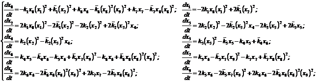 Для исследования кинетики протекания указанных реакций авторами на основе закона действующих масс построена математическая модель, представляющая собой задачу Коши для системы обыкновенных нелинейных дифференциальных уравнений: