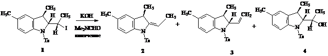 С целью получения производного 2-(1-гидроксиэтил)индолина через реакцию непосредственного нуклеофильного замещения иода индолин 1 нагревали с KOH в ДМФА. Основным продуктом реакции оказалось этилиденовое производное 2, соотношение которого с винильным изомером 3 составляет ≈ 100:35. Доля 2-(1-гидроксиэтил)-замещенного индолина 4 не превышает 10%.