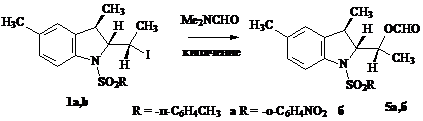 Кипячение йодэтилиндолинов 1а, б в ДМФА в течение 5 ч дает эфир муравьиной кислоты 5а, б.