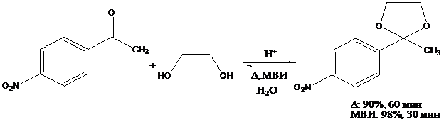 Установлено, что по сравнению с конвекционным нагревом, микроволновое излучение мощностью 200 Вт увеличивает выход 2-метил-2-(4’-нитрофенил)-1,3-диоксолана (2) и сокращает время синтеза в 2 раза.