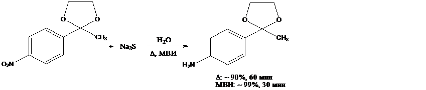 Восстановление нитродиоксолана (2) до аминодиоксолана (3) в условиях микроволнового нагрева протекает с количественным выходом и в 2 раза быстрее, чем при конвекционном нагреве.