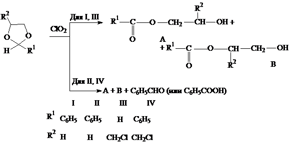 В реакции СlO2 с циклическими ацеталями, содержащими во втором положении фенильный заместитель, наряду с моноэфирами получаются бензальдегид и (или) бензойная кислота.