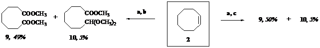 Применение в качестве растворителя в реакции озонолиза смеси (1:1) хлористого метилена и метанола (опыт С) снизило выход эфирокислоты (VII) до 63%. При этом в качестве минорных продуктов были зарегистрированы дикетокислота (VI), кетоэфир (VIII) – полупродукт в синтезе