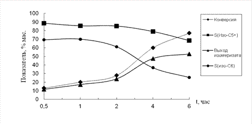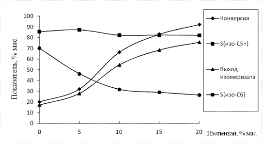 При концентрации изопентана в сырье 10% мас. происходит существенный рост показателей процесса; конверсия равна 67% мас., выхода изомеризата – 56% мас. Селективность по жидким изокомпонентам практически не изменяется и находится в интервале 80-85% мас Рис.2.(кривая SИзоС5+). При этом селективность образования изогексанов снижается с 70 до 30% мас. Рис. 6 (кривая - изогексаны).