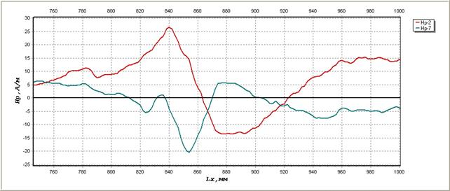 На фрагменте, представленном на рисунке 2, видно, что расстояние между экстремальными значениями поля Нр является кратным толщине стенки обечайки резервуара (δст=8мм). Эти расстояния фиксировались по расположению линий Нр=0, соответствующих площадкам скольжения.