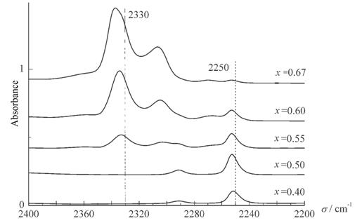 Характерная ИК – область спектров поглощения находится в интервале от 2200 см-1 до 2400 см-1 (Рисунок 1). По полученным спектрам видно, что в области 2330 см-1 с повышением содержания AlCl3 происходит увеличение пика поглощения, что вероятнее связано со значительным усилением кислотных свойств.