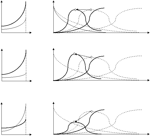 Так, например, при постоянстве соотношения к1 /к2 по длине реактора (рис. 1,а) можно ожидать сохранения выхода компонента В при сокращении времени реакции и длины реактора L (рис.2,а) по сравнению с изотермическим процессом. Если соотношение к1 /к2 по длине реактора возрастает (рис. 1,б), то можно предполагать, что выход компонента В должен увеличиваться при сокращении времени реакции и длины реактора (рис.2,б) по сравнению с изотермическим процессом. В том случае, когда соотношение к1 /к2 по длине реактора снижается (рис. 1,в), то при сокращении времени реакции и длины реактора (рис.2,в) по сравнению с изотермическим процессом можно предполагать, что выход целевого компонента В станет уменьшаться и необходимо от адиабатического реактора перейти к политропической конструкции с отводом тепла внешним хладагентом, варьируя температуру реакционной смеси таким образом, чтобы выход целевого продукта не только не снижался, но даже и возрос при существенном увеличении размеров реактора.