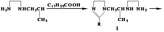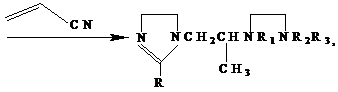 Взаимодействием 5-метил-триэтилентетрамина (метил-ТЭТА) с олеиновой кислотой при температуре сначала 120-140°С, затем при 248-250°С был получен имидазолин (1), который с нитрилом акриловой кислотой (НАК) легко реагирует при 55-60°С в мольном соотношении имидазолин : НАК = 1 :