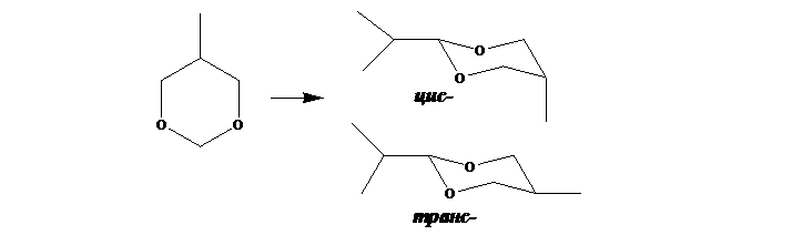 В продуктах превращений 5-метил-1,3-диоксана на суперкислотных катализаторах (степень превращения достигает 35%) одним из основных продуктов реакции (выход около 50%) является 2-изопропил-5-метил-1,3-диоксан, представляющий собой смесь цис- и транс- изомеров в соотношении 1:2.