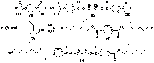Работа проводилась в 2 этапа: получение вторичной ТФК, смесь соединений (1) и (2), путем химического разложения ПЭТФ-бутылкии синтез на её основе с 2-этилгексанолом (3) ДОТФ(4) (рис.1):