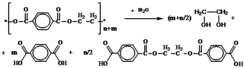 Переработка ПЭТФ проводилась в несколько этапов: подготовка сырья (сортировка, измельчение, отмывка), гидролиз в среде этиленгликоля в присутствии щелочи натрия, нейтрализация полученной массы разложения, фильтрация, промывка и сушка ТФК. Предполагаемая реакция представлена на рис.1.