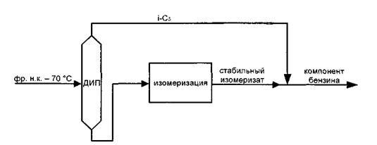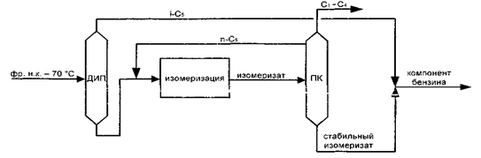Схема с колонной деизопентанизации (ДИП). В этой схеме до изомеризации с помощью колонны ДИП выделяют из сырья высокооктановый изопентан, который далее смешивается и изоризатом.