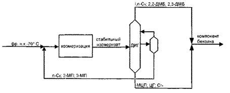 Схема с колонной деизогексанозации (ДИГ) после реактора изомеризации. При этом непрореагировавшие низкооктановые компоненты (метилциклопентан и н-гексан) рециркулируются в реактор. Однако данная схема позволяет увеличить конверсию гексанов, но не повышает содержание изопентанов в продукте.
