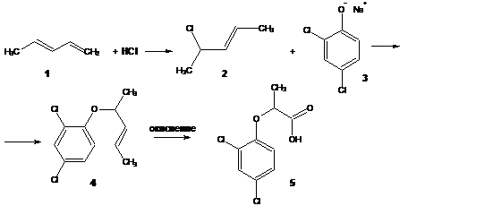 Отправной точкой данного исследования является необходимость утилизации побочного продукта 1,3-пентадиена (пиперилена), образующегося в больших количествах в промышленном производстве изопрена. Фракция пипериленовая представляет собой смесь углеводородов С5 и выше, это легкоподвижная жидкость с резким запахом, темно-коричневого цвета, относится к третьему классу опасности. Одним из возможных путей решения проблемы является использование 1,3-пентадиена в качестве полупродукта в синтезе ряда гербицидов производных арилоксипропионовой кислоты.