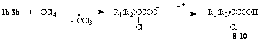 2,2,3,3-тетразамещенные производные (5-7), а также α-хлоркарбоновые кислоты (8-10). Наряду с продуктами окислительного сочетания в реакционной смеси присутствует хлороформ (11).