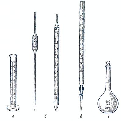 Рис. 2. Мерная посуда: а – мерный цилиндр; б – пипетки; в – бюретка; г – мерная колба