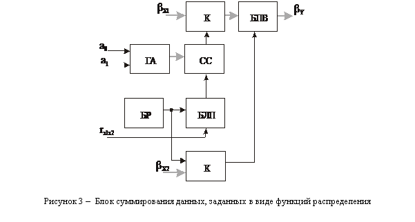 Структура блока суммирования статистических данных, заданных в виде функций распределения, представлена на рис.3, где обозначено: ГА – генератор аргумента, СС – схема совпадения, БЛП – блок линейного преобразования.