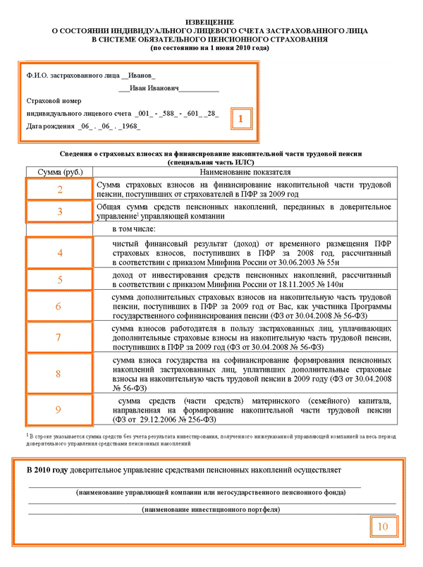 3. Эта общая сумма Ваших пенсионных накоплений с даты, когда начала формироваться накопительная часть Вашей будущей пенсии, переданных Пенсионным фондом Российской Федерации в доверительное управление управляющей компании или негосударственному пенсионному фонду. В строках с 4 по 9 показано, за счет каких показателей изменилась эта сумма с момента направления Вам предыдущего извещения (без указания дохода от инвестирования указанных средств, полученного управляющей компанией (в случае, если средства Ваших пенсионных накоплений в 2009 и 2010 годах находятся в доверительном управлении одной и той же управляющей компании).