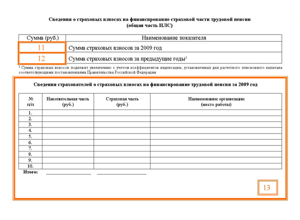 11, 12. В этой таблице указаны сведения о страховых взносах, которые поступили на формирование страховой части трудовой пенсии. В ее первой строке (11) – сумма страховых взносов, поступивших на Ваш счет в 2009 году. Во второй строке (12) – сумма страховых взносов, поступивших с 2002 по 2008 год.