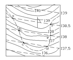б) по полученным заложениям в границах планировки, строят остальные горизонтали проектируемой плоскости; находят точки нулевых работ а, в, с, т. е. границу между выемкой и насыпью, которые соединяют плановой кривой;