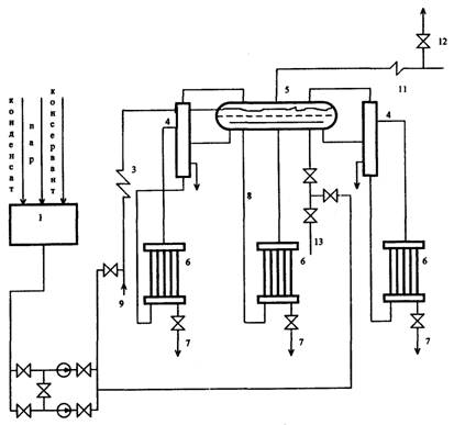 110. В бак 1, где установлен теплообменник 4, загружается консервант. Путем обогрева бака питательной водой (Т = 100 °С) получают расплав консерванта, который насосом 2 подается в линию 9 на всас питательного насоса ПЭН.