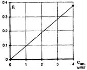 Ход анализа следующий: аликвотную пробу исследуемой водой эмульсии октадециламина доводит водой до 100 мл и помещают в делительную воронку, добавляют 4 мл ацетатного буферного раствора с pH=3,5, 2 мл 0,05%-го водного раствора индикатора метилового оранжевого, 20 мл хлороформа и встряхивают в течение 3 мин. Затем добавляют еще 50 мл хлороформа, встряхивают 1 мин, после чего дают смеси отстоятся. После расслоения хлороформный экстракт фотометрируют на фотоколориметре в кювете 1 см со светофильтром, имеющим максимум светопропускания при 430 нм. Калибровочный график для определения октадециламина в воде приведен на рисунке.