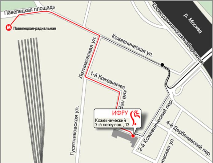 Станция метро "Павелецкая-радиальная", первый вагон из центра, указатель "выход в город к Павелецкому вокзалу". Выйти из здания вокзала, повернуть направо, идти по ул. Кожевническая вдоль трамвайных путей до первого поворота направо (ул. Летниковская), далее по ул. Летниковская до первого поворота налево (1-й Кожевнический пер.) и по 1-му Кожевническому пер. (переулок делает 2 поворота - направо и налево) до здания офиса, найти подъезд, на котором будет вывеска «Институт фондового рынка и управления». Институт располагается на 1 этаже. Дежурный объяснит Вам, в какую аудиторию пройти. |