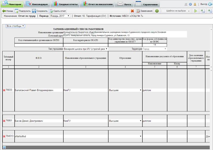 Форма отчета ежемесячная. Период «Январь 2017» необходимо заполнить вручную, а последующие периоды можно подгружать воспользовавшись кнопкой на верхней панели «Подгрузить». По данным первичного отчета «12. Анализ заработной платы - ДЛЯ ДЕПАРТАМЕНТА» формируются сводные отчеты: