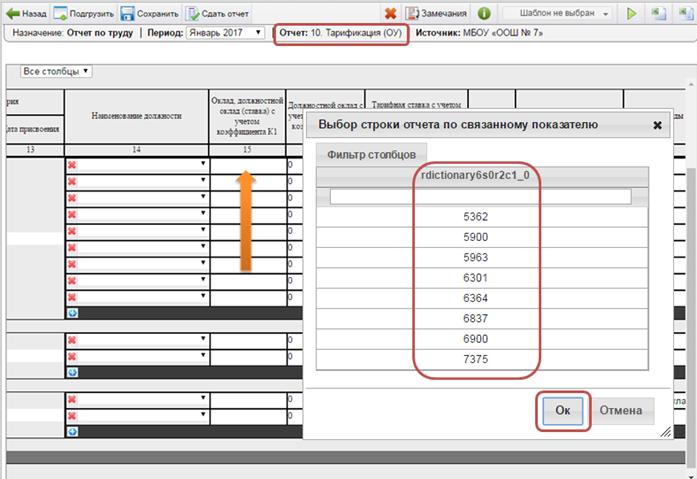 Графа 15, при нажатии на ячейку, появится окно для выбора оклада. Кликните мышкой по нужной позиции из справочника и ниже нажмите кнопку «Ок»