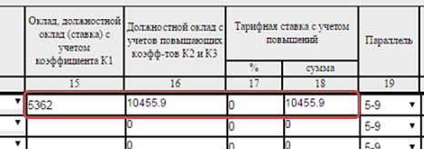 4) Ещё ниже (выделено фиолетовым цветом), в расчётных ячейках отображены значения из штатного расписания.